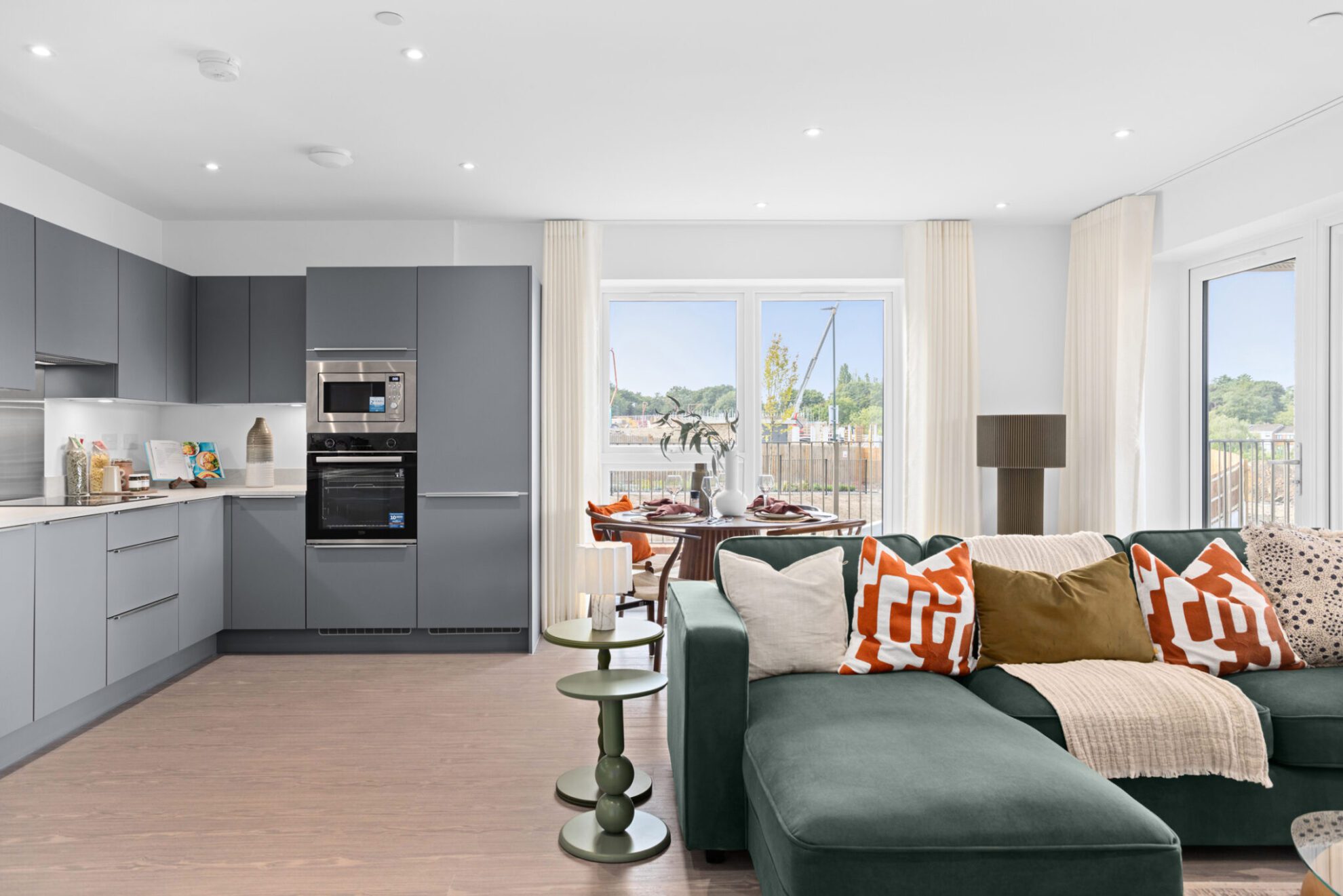 Take a look around our show apartment with open-plan living spaces, full-length windows and views onto the ecology area.
